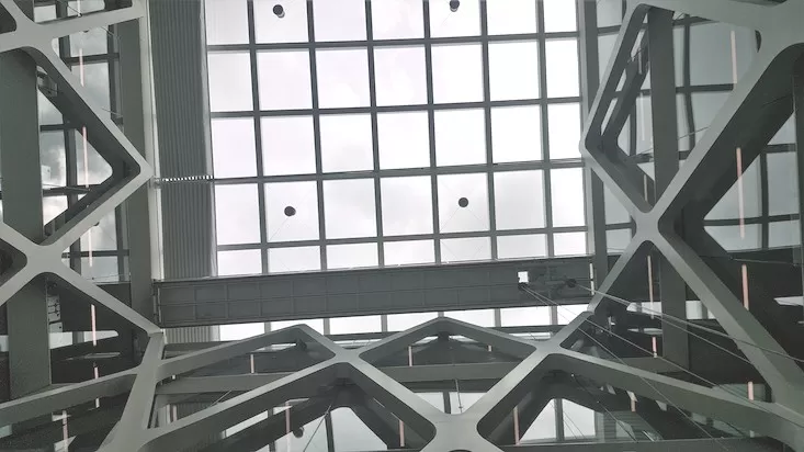 This design presented a number of challenges only a customised access solution could meet. For the outside of the building, a Building Maintenance Unit on a free laid track system was specially designed to reach every surface. For the inside of the building and the atrium, a special gantry was developed with a hanging, removable platform which can traverse and slew to reach all interior facades of the atrium.