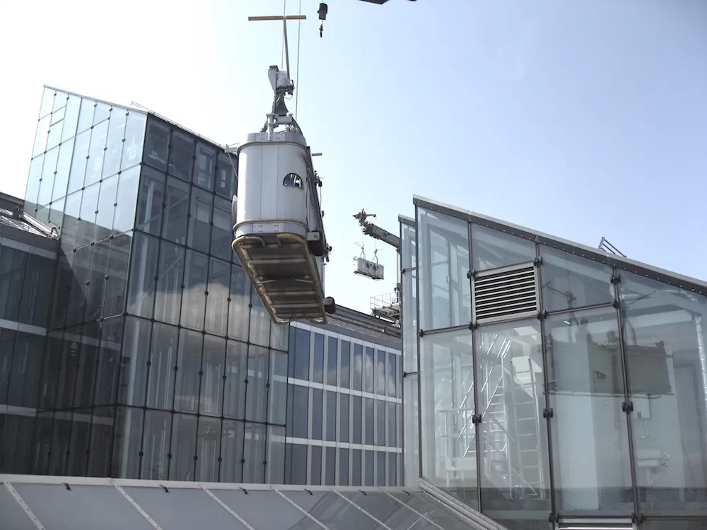 This design presented a number of challenges only a customised access solution could meet. For the outside of the building, a Building Maintenance Unit on a free laid track system was specially designed to reach every surface. For the inside of the building and the atrium, a special gantry was developed with a hanging, removable platform which can traverse and slew to reach all interior facades of the atrium.