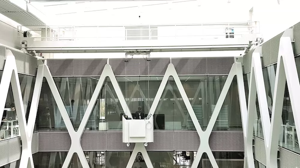 Manntech designed two hanging ‘spider’ cranes with self-hoisting platforms. The arms of the hanging cranes can pivot in various places in order to reach every section of glass. The solution also provides a material hoist for weights up to 250 kg. All movements are pre-programmed to provide precision and ease of use for operators.