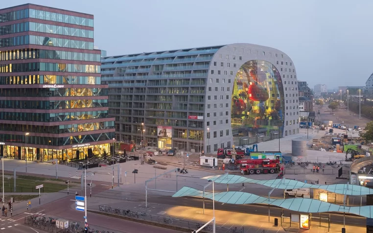 Markthal, or The Market Hall is a mixed-use development which encompasses bars, restaurants and 228 apartments which form an arch stretching over the bustling central marketplace. The development features a flexible suspended glass facade, the largest of its kind in Europe and the ceiling of the market is completely covered with a breathtaking work of art.